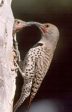 A Northern Flicker is a large brown spotted woodpecker.