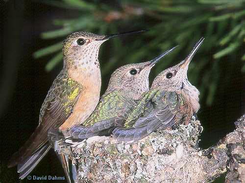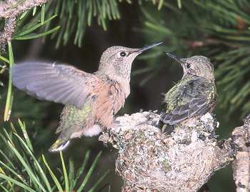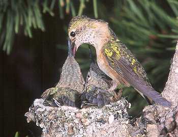 She would perch on the edge of the nest, then regurgitate the nectar into a chick's open mouth.