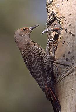 The adult flicker eats ants and tiny worms, then regurgitates into the baby's gaping mouth as they both rapidly vibrate their heads back and forth.