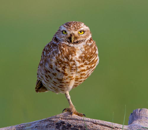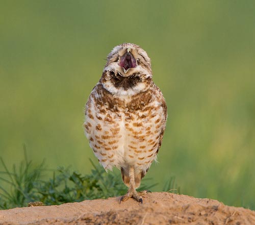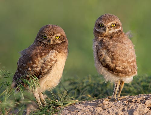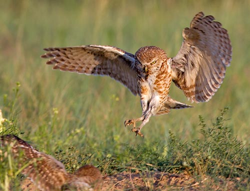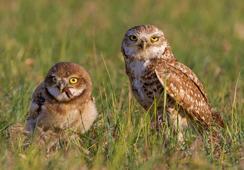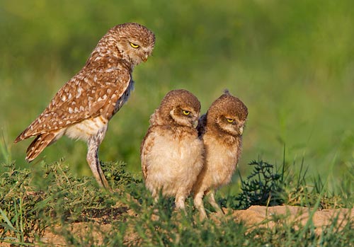 Usually the owlets just stand around near a prairie dog hole, but they come running when a parent arrives carrying a bug.