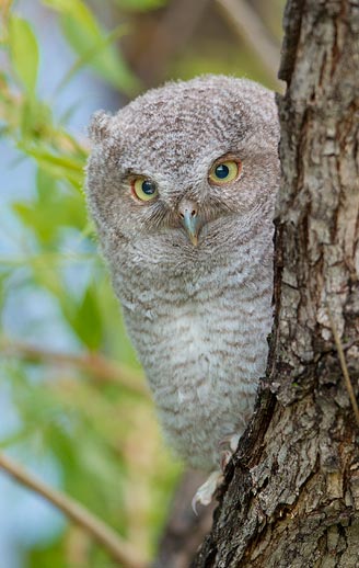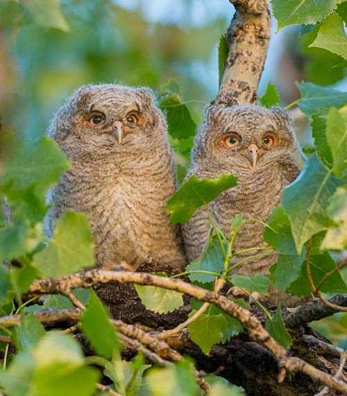 Two days after they first appeared, the two owlets were sitting side-by-side in a different tree, only visible through a gap in the leaves.