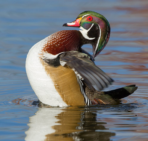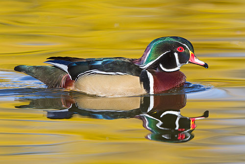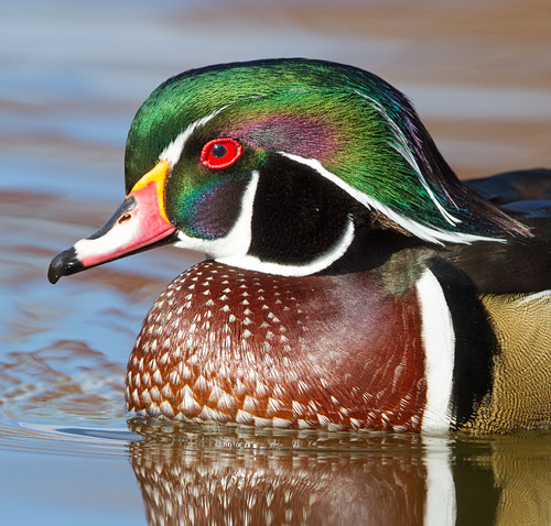 Wood ducks drakes are very elegant with their iridescent multicolored plumage and red eyes.