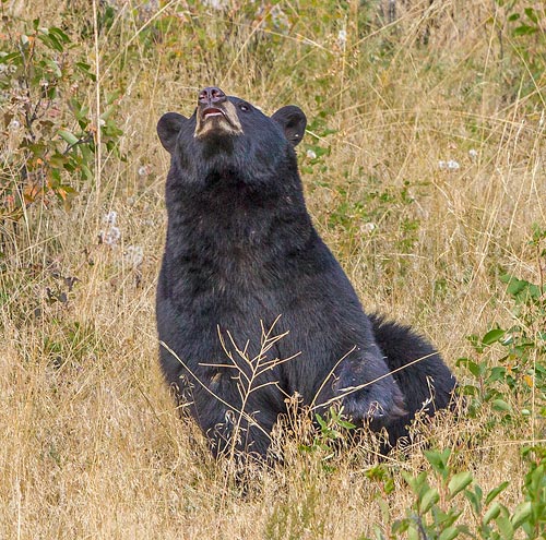 This big black bear wandered across the hillside, stopped to scratch an itch, looked around, and then sniffed.