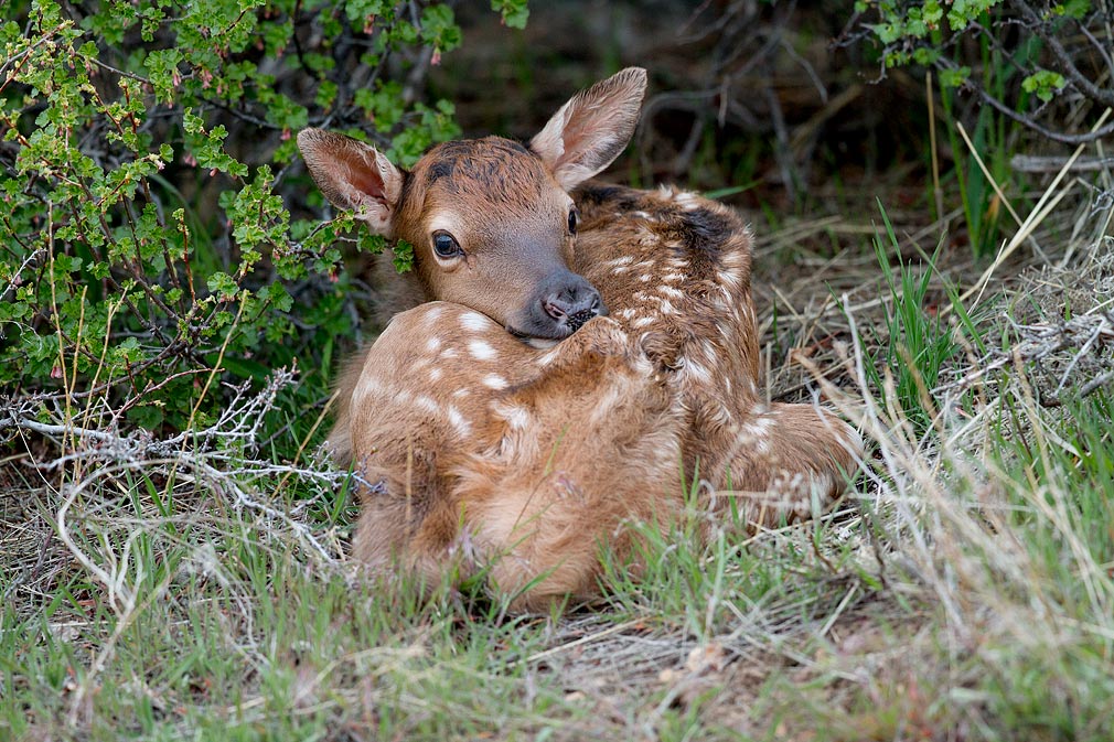 I was a bit surprised to see this adorable baby elk curled up and hiding under a bush very close to the road.