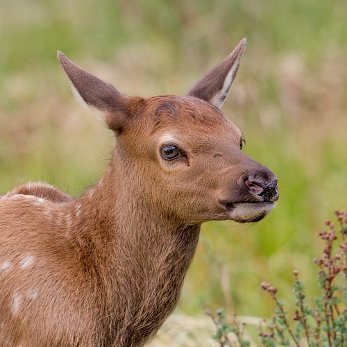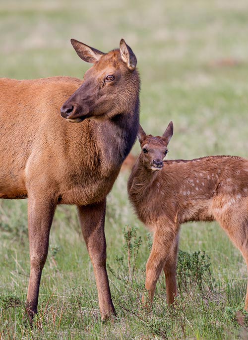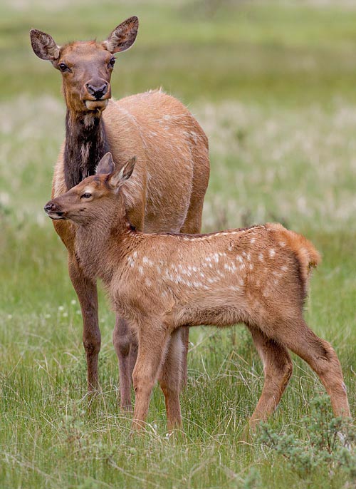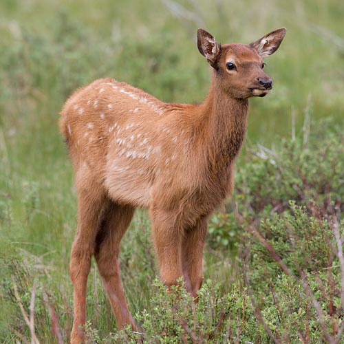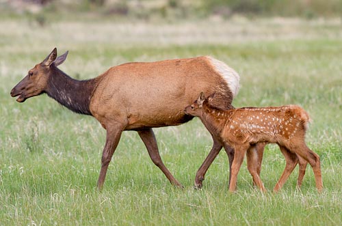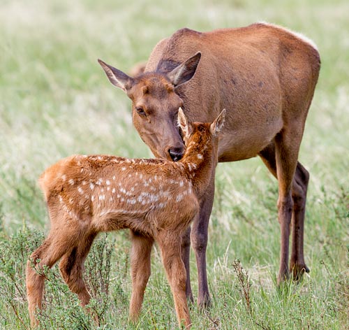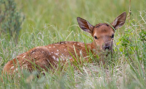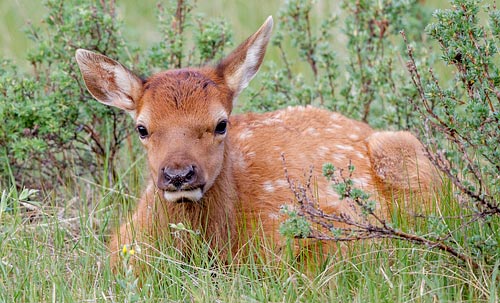 Baby elk are born in late May. They are not easy to see because mama elk conceal their calves under tall grass or bushes while they graze nearby.