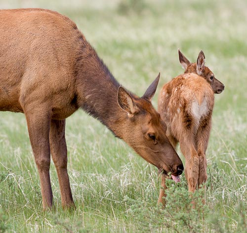 Sometimes the mother elk would groom her calf by licking it.