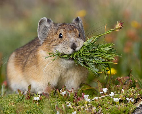 All summer they diligently gather mouthfuls of plants, then rapidly scamper across the rocky tundra to their cache under jagged rocks.