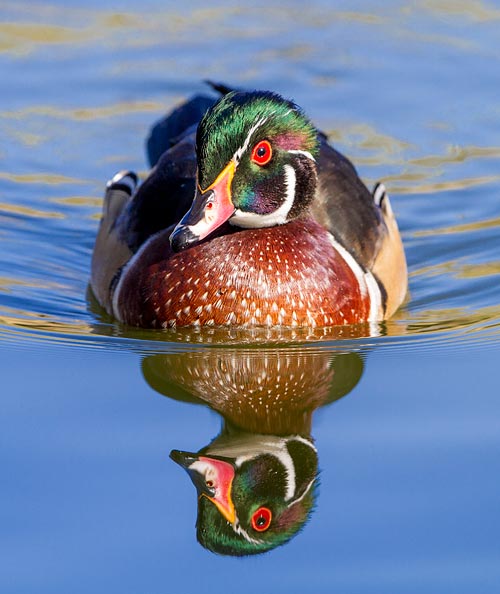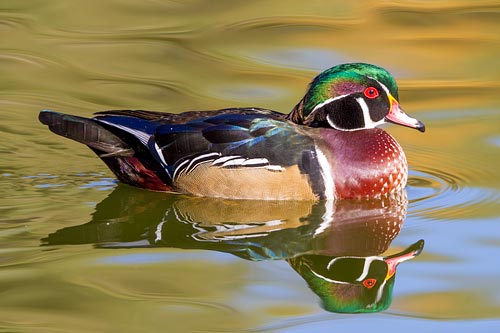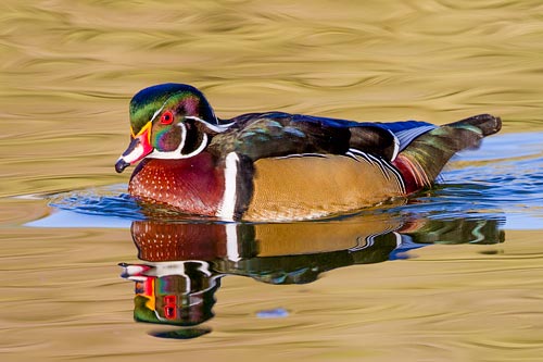 Wood duck drakes have colorful iridescent plumage that shimmers in the sunlight.